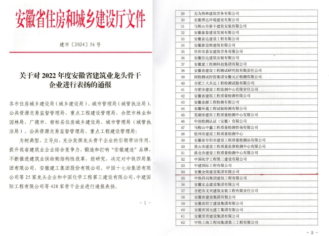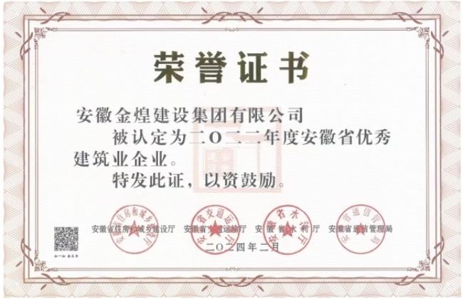 4月10日,安徽省住房和城乡建设厅公布了建市(2024)56号文关于对2022年度安徽省建筑业龙头骨干企业进行表扬的通报。安徽金煌建设集团有限公司获评“安徽省建筑业优秀骨干企业”称号。
