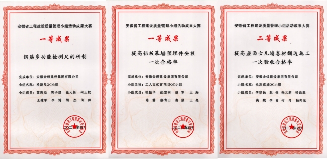 金煌集团选派陈静和何冉两位同志参加发布两项QC课题《钢筋多功能检测尺的研制》和《提高屋面女儿墙卷材翻边施工一次验收合格率》荣获省级QC一等成果,一项交流课题《提高铝板幕墙预埋件安装一次合格率》荣获省级QC二等成果,充分展现了金煌集团优秀质量管理小组的实力和风采。