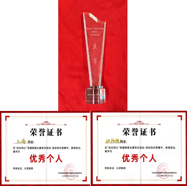 为积极贯彻党中央印发了修订后的《中国共产党纪律处分条例》(以下简称《条例》)。深入学习贯彻习近平总书记关于党纪学习教育的重要讲话和重要指示精神,推动《条例》入脑入心,深化《条例》理解运用,教育引导党员准确掌握《条例》的主旨要义和规定要求,金煌党委积极参加由合肥市建筑工程协会主办的“柱石同心”党建联盟主题党日活动,选派王海、张艳艳2名党员同志代表参加竞赛,经过必答题、限时答题、抢答题、加赛题、观众题等多环节层层角逐,最终荣获团体亚军的好成绩。