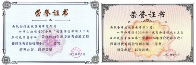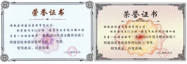2024年6月2日至6月4日,由安徽省市政工程协会与合肥市市政工程协会共同举办的安徽省暨合肥市2024年度市政工程建设优秀QC小组活动成果交流会顺利召开。金煌集团选派聂彬彬和陈静两位同志参加发布的两项QC课题《提高沥青混凝土上面层观感质量合格率》和《提高市政管线沟槽回填质量一次性合格率》分别荣获省级及市级QC一等成果与二等成果。同时,金煌集团还荣获2024年安徽省与合肥市市政工程建设QC小组活动优秀企业奖。
