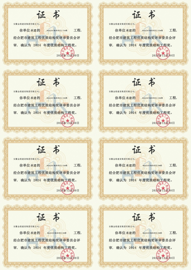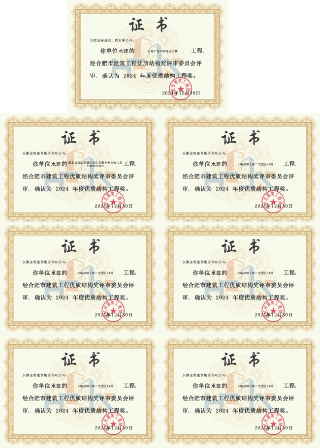 从合肥市建筑工程协会公布2024年1-10月合肥市建筑工程优质结构奖的通知获悉,由金煌集团承建的JK202207地块项目(中海璟园)、BH202307地块项目(中海臻如府)、长临河镇丁陈二安置区建设项目EPC总承包1标段、肥东县妇幼保健计划生育服务中心公共卫生楼建设项目、金煌广场1#商务办公楼共5个项目的15个单体荣获合肥市建筑工程优质结构奖。