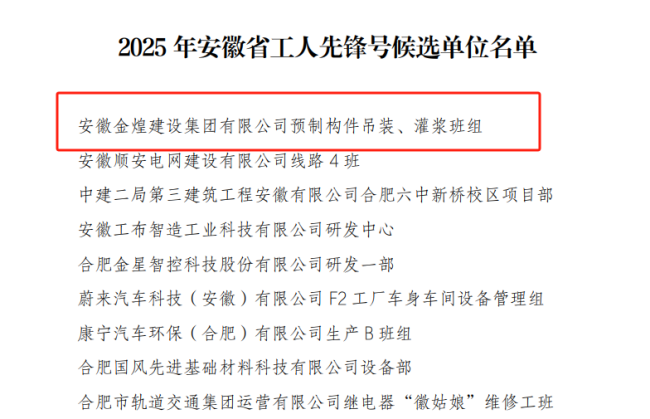 在刚刚结束2025年安徽省五一劳动奖、工人先锋号和省劳动竞赛先进个人表彰中,安徽金煌建设集团有限公司预制构件吊装、灌浆班组凭借卓越的团队表现、创新的技术应用及团队协作精神、突出的工作业绩以及在行业内的示范引领作用,荣获2025年度“安徽省工人先锋号”荣誉称号。这一殊荣是安徽省人民政府对在建筑领域作出突出贡献的集体给予的最高表彰。