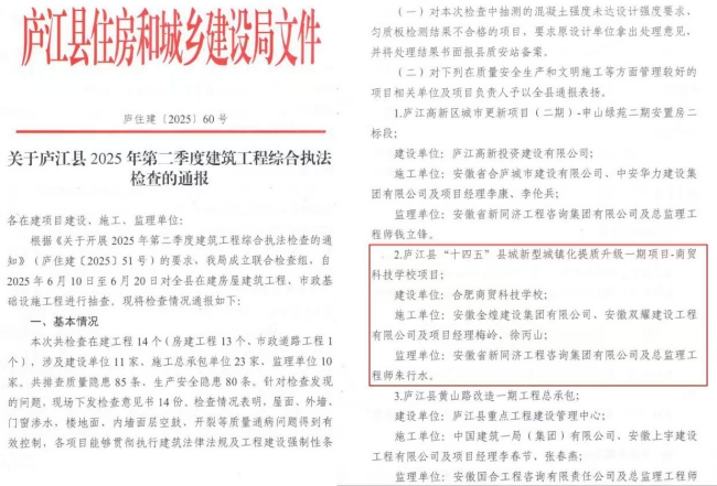 7月9日,庐江县住房和城乡建设局发布《关于庐江县2025年第二季度建筑工程综合执法检查的通报》,金煌集团承建的合肥商贸科技学校在二季度综合执法检查中,质量安全和文明施工等方面管理突出,受庐江县建设局通报表扬。