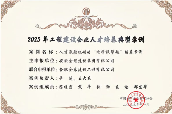 近日,中国施工企业管理协会公布2025年工程建设企业人才培养案例评审结果,24篇工程建设人才培养典型案例脱颖而出。由安徽金煌建设集团有限公司牵头合肥金春建设工程有限公司联合申报的《人才激励机制的“比学敢帮超”培养案例》成功入选“2025年工程建设企业人才培养典型案例”,也是安徽省民营企业唯一入选的典型案例。该案例以“竞争+协作”的双轮驱动为核心,构建了具有行业示范价值的人才培养新模式。