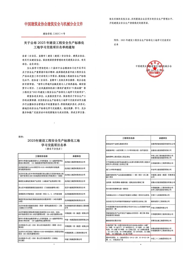 近日,中国建筑业协会建筑安全与机械分会公布了“2025年建设工程安全生产标准化工地学习交流项目名单”,我司承建的长临河镇丁陈二安置区建设项目EPC总承包1标段工程凭借完善的安全管理体系、规范的现场管控措施、融合了绿色、智能建造理念及卓越的安全实践成效,成功入选这一国家级榜单,彰显了企业在安全生产标准化建设领域的持续引领地位。