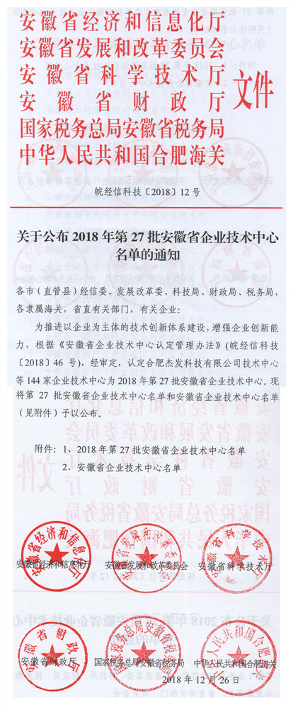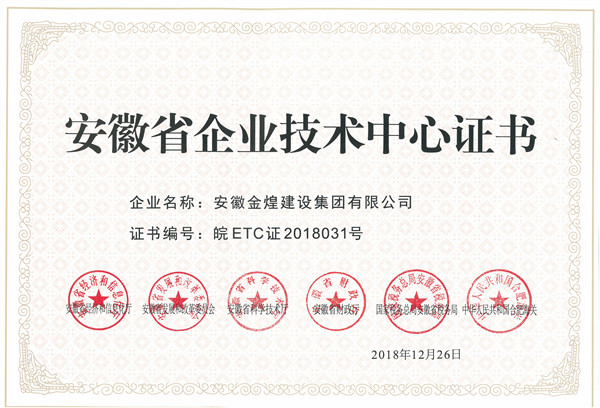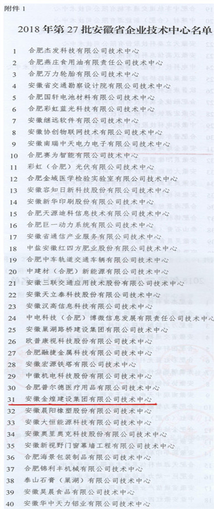 2019年1月3日,安徽省经信委网站正式公布了第27批安徽省企业技术中心名单,安徽金煌建设集团有限公司列居其中。