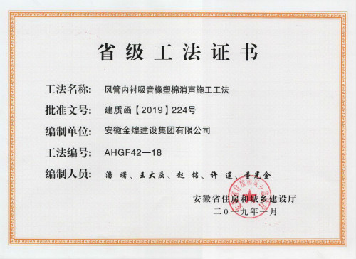 近日,安徽省住房和城乡建设厅颁发了2018年度安徽省省级工法证书。安徽金煌建设集团共获得了《基于BIM的双曲面板幕墙施工工法》《风管内衬吸音橡塑棉消声施工工法》《高层建筑封闭式液固自消能垃圾道施工工法》3项工法。