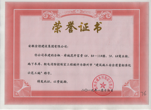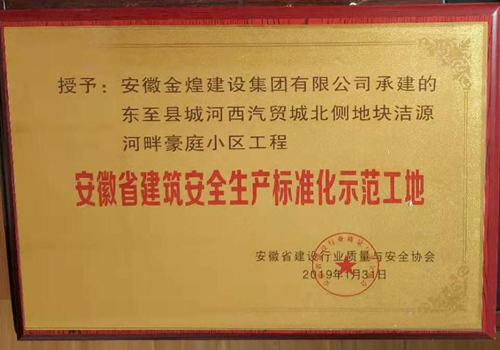 日前,从安徽省住房和城乡建设厅和滁州市建委获悉,由金煌集团承建的东至县城河西汽贸北侧地块洁源河畔豪庭小区和全椒花开富贵6#、8#~11#楼、5#、6#商业街、地下车库工程分别荣获安徽省建筑施工安全生产标准化示范工地和滁州市市级建筑施工安全生产标准化示范工地称号。