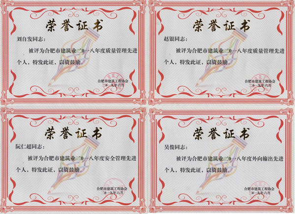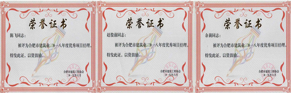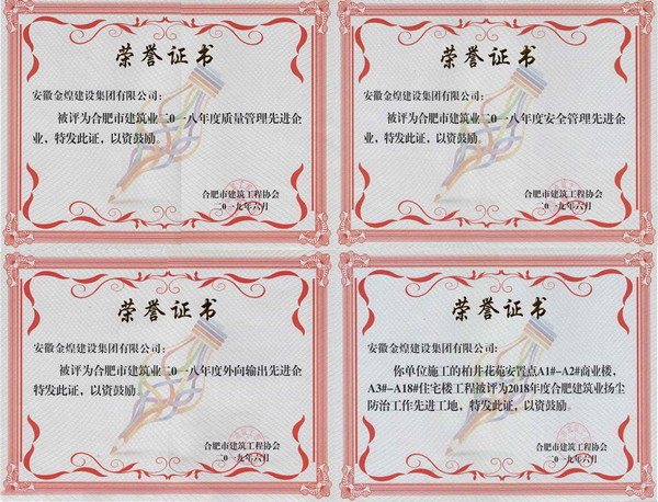 2018年全年先后获“全国建设工程项目施工安全生产标准化工地”1项,“省级建筑施工安全生产标准化工地”2项,“合肥市建筑施工安全生产标准化工地”7项,“阜阳市建筑施工安全生产标准化工地”1项,“滁州市建筑施工安全生产标准化工地”1项,安徽省建设工程优质工程“黄山杯”奖1项,合肥市建筑工程优质工程“琥珀杯”奖3项,“合肥市建筑工程优质结构工程奖”5项等荣誉。