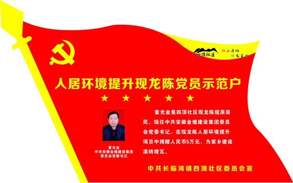 安徽金煌建设集团党委书记、童光金先生作为长临河镇现龙陈居民为家乡的人居环境提升项目捐赠5万元现金。他表示:这里是生我养我的家乡,我不能忘本。在我能力范围之内,我要为家乡发展贡献一份力量,建好家乡,提升环境,也希望更多走出去的家乡同胞能多回去看看,为家乡发展出谋划策,让我的父老乡亲们生活得更幸福美满。