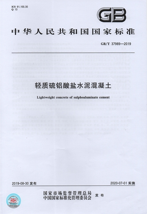 近日,国家市场监督管理总局和国家标准化管理委员会共同发布了《轻质硫铝酸盐水泥混凝土》GB/T37989-2019国家标准。这是安徽金煌建设集团参与编制的首个国家标准,童光金董事长为主要起草人之一。此标准于2019年8月30日发布,2020年7月1日正式实施。