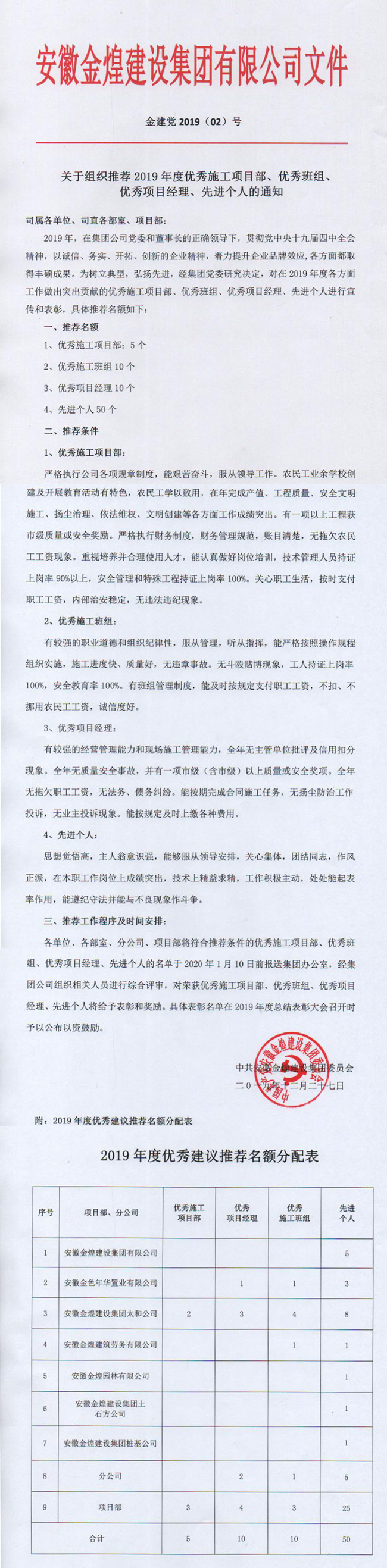 关于组织推荐2019年度优秀施工项目部、优秀班组、 优秀项目经理、先进个人的通知