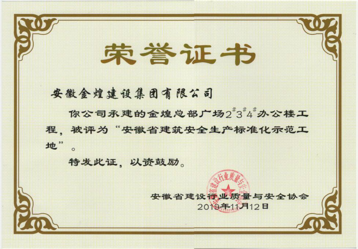近日,安徽省建设行业质量与安全协会公布了2019年度第三批安徽省建筑安全生产标准化工地(小区)名单,集团承建的金煌广场2#、3#、4#办公楼工程荣获“安徽省建筑安全生产标准化示范工地”称号,该项目是2019年度荣获的第四个省级建筑安全生产标准化示范工地。