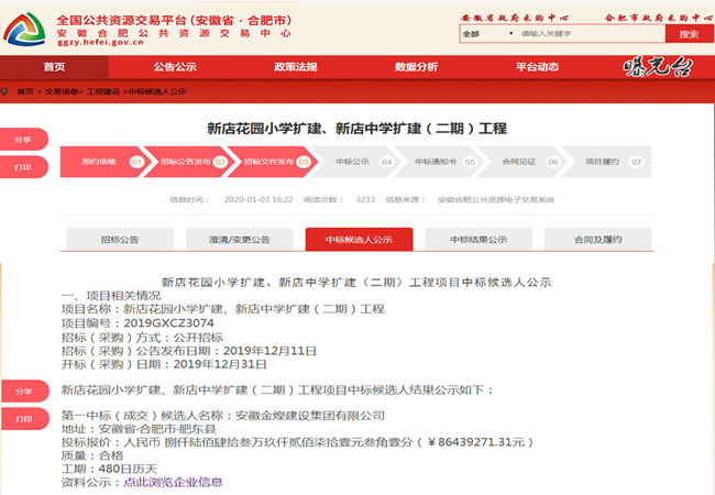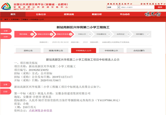 近日,从合肥市公共资源交易中心了解到,金煌集团新年开门红,5天连中三个标的好消息,共计揽金约1.6亿元人民币,开启了2020年集团经营工作的好兆头。