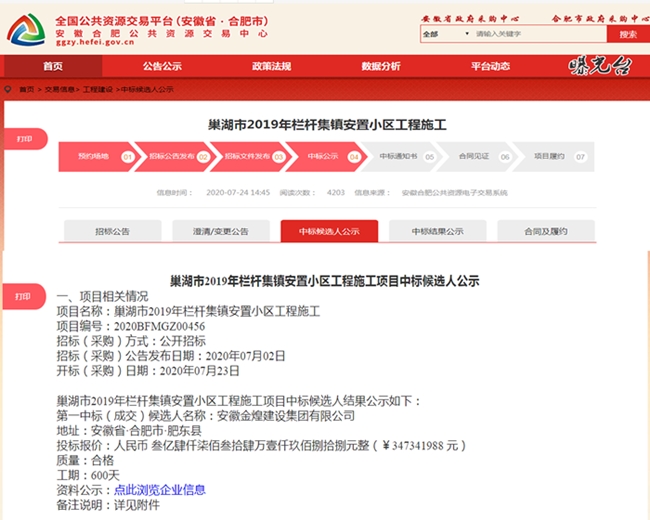 盛夏时节,万物并秀,集团公司经营战线捷报频传。近日,从合肥市公共资源交易中心获悉,金煌集团参加投标的巢湖市2019年栏杆集镇安置小区工程经过层层角逐,脱颖而出,最终获得中标候选人资格。这是继肥东店埠镇岱河花园项目后又一民生安置小区项目。