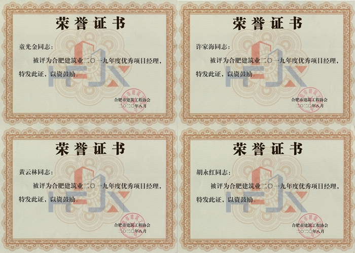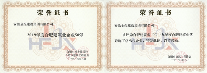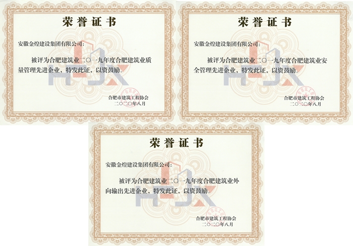 2019年全年安徽金煌建设集团所承建的工程项目中,先后获得奖项的有:“全国建设工程项目施工安全生产标准化工地”2项、“省级建筑施工安全生产标准化工地”5项、“市建筑施工安全生产标准化工地”9项、“华东地区优质工程奖”1项,“合肥市建筑工程优质工程‘琥珀杯’奖”5项、“合肥市建筑工程优质结构工程奖”4项,同时获得“合肥市建筑业20强”称号、“合肥市优秀总承包企业”等荣誉。
