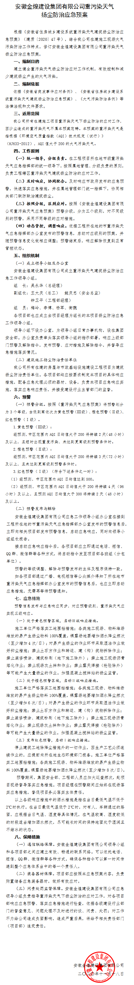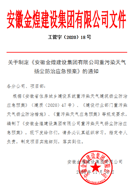 关于制定《安徽金煌建设集团有限公司重污染天气扬尘防治应急预案》的通知