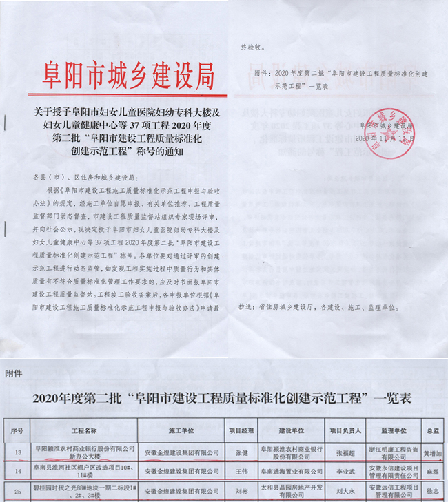 近日,从阜阳市城乡建设局获悉,我公司承建的碧桂园时代之光88#地块一期二标段、阜南县淮河社区棚户区改造项目、阜阳颍淮农村商业银行股份有限公司新办公楼三项目分别荣获阜阳市质量、安全标准化工地称号。