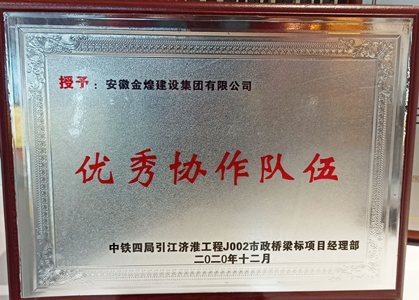 金煌集团在2020年度参与中铁四局引江济淮市政桥梁劳务分包项目工作中,现场管理标准高,执行力强,被中铁四局授予“优秀协作队伍称号”。后疫情时代,随着大规模民工荒现象的出现,中铁四局更加充分认识到施工生产中协作队伍的举足轻重的重大作用,积极采取各种举措,严把协作队伍进场和使用的各道关口,并树立让协作队伍合作双赢的观念,与施工能力强、履约能力佳、社会信誉好的协作队伍合作。