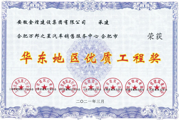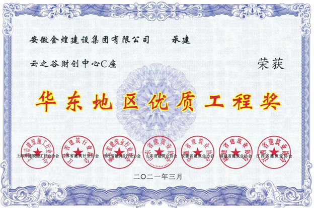 近日,从浙江省建筑业协会发布的表彰2020年度华东地区优质工程奖的通知获悉,由安徽金煌建设集团承建的云之谷财创中心C座工程和合肥万邦之星汽车销售服务中心工程荣获2020年度“华东地区优质工程奖”。