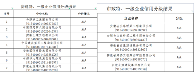 自2020年6月,合肥市城乡建设局第一次开展施工总承包企业信用评价工作,将企业获表彰、表扬、创优夺杯等设为信用加分项,将企业受到行政处罚、通报批评、停工、约谈、安全生产责任事故、未按招投标文件履约变更项目经理、受到投诉、“清欠”中发生严重群体性事件、质量问题严重,互相推诿、不履行保修义务等作为信用扣分项。市城乡建设局将企业各类信用得分汇总进行排名,为区别企业大小规模、保证公平公正,按照不同资质等级对企业进行信用评级,并定期向社会发布评价结果。