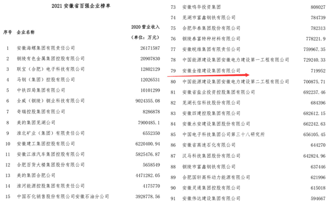 百舸争流,奋楫者先,千帆竟发,勇进者胜。12月7日上午,安徽省企业联合会、安徽省企业家联合会在合肥古井假日酒店发布2021年度安徽企业100强榜单。安徽金煌建设集团继续荣列安徽百强企业行列,列居排行榜第79位,这是金煌集团连续8年继续保持安徽企业百强称号。