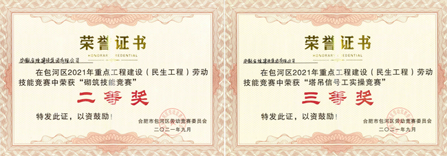 为大力弘扬劳模精神、工匠精神,根据《包河区2021年重点工程建设(民生工程)劳动竞赛实施方案》文件精神,合肥市包河区总工会和合肥市包河区住房和城乡建设局于2021年9月10日上午在包河区休宁路ACD项目举办包河区2021年重点工程建设(民生工程)劳动竞赛活动。安徽金煌建设集团作为参赛单位积极参与包河区重点工程建设并在劳动竞赛中取得砌筑技能竞赛二等奖和塔吊信号工实操竞赛三等奖的好成绩,被合肥市包河区住房和城乡建设局表扬通报。