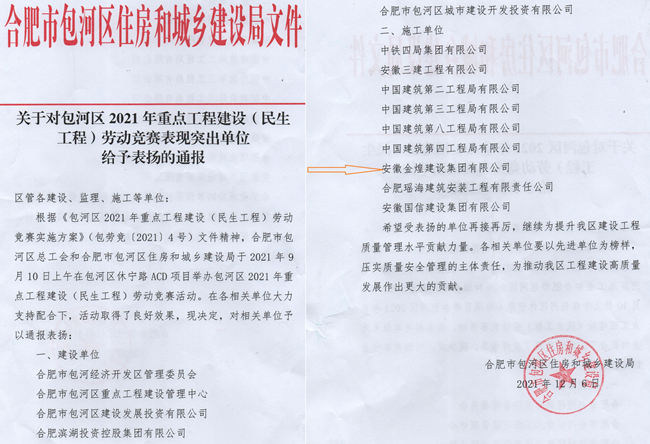 金煌集团获包河区重点工程建设劳动竞赛表现突出单位的表扬通报