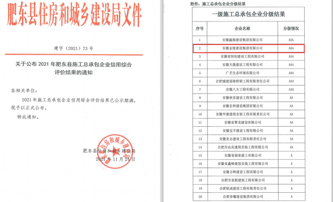 为进一步强化建筑市场信用体系建设,依据肥东县政府《进一步促进建筑业高质量发展实施意见》(东政办秘【2021】5号)文件精神,肥东县住房和城乡建设局经会议研究组织开展2021年第一次肥东县建筑业施工总承包企业信用综合评价工作,此次评价工作是经施工总承包企业按照资质类别自愿申报综合基础性资料,专家按照税收、业绩、荣誉、社会责任等方面综合评审,最终评价结果通过肥东县政府网站等向社会公示公告,金煌集团荣获肥东施工总承包AAA级信用评价称号。