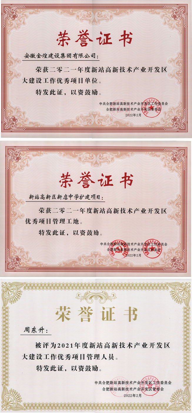 春潮澎湃,鼙鼓声急,催人奋进。合肥新站高新区2022年大建设工作会议于正月十五上午在合肥新站高新区管委会隆重召开。安徽金煌建设集团喜获优秀项目管理单位、七里塘花园施工总承包项目优秀项目管理人员周东升、新站高新区新店中学扩建项目优秀项目管理工地奖共三项荣誉,获此殊荣是对金煌集团参与合肥新站区大建设工作的认可。金煌集团副总经理许莲同志受邀参会并上台领奖。