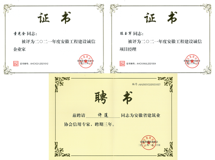 近日,从安徽省建筑业协会公布的皖建协(2022)1号文关于2021年度安徽工程建设诚信典型企业、AAA信用企业、诚信企业家、诚信项目经理的名单中获悉,安徽金煌建设集团有限公司荣获2021年度安徽省工程建设行业诚信典型企业称号、2021年度安徽建设工程AAA级信用企业称号、党委书记董事长童光金先生荣获2021年度安徽工程建设诚信企业家称号、项目经理陈玉军同志荣获2021年度安徽工程建设诚信项目经理称号、副总经理许莲同志入选安徽省建筑业协会信用专家。