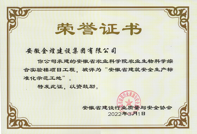 近日,从安徽省建设行业质量与安全协会公布2021年度第四批“安徽省建筑安全生产标准化示范工地”名单获悉,由安徽金煌建设集团有限公司承建的安徽省农业科学院农业生物科学综合楼项目和颍上县中医院新住院病房楼项目荣获2021年度第四批“安徽省建筑安全生产标准化示范工地”,项目负责人余从云、屈云峰被授予“优秀项目经理”称号。