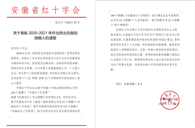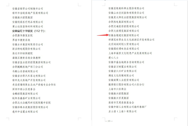 近日,从安徽省红十字会发布的皖红办〔2022〕21号文关于表彰2020-2021年作出突出贡献的捐赠人的通报中获悉,安徽金煌建设集团有限公司被安徽省红十字会授予“安徽省红十字银奖”称号。自新冠肺炎疫情防控阻击战打响以来,安徽省广大爱心单位和爱心人士积极善举彰显了社会责任和爱心情怀,涌现出一大批先进爱心单位、爱心人士和优秀志愿者。