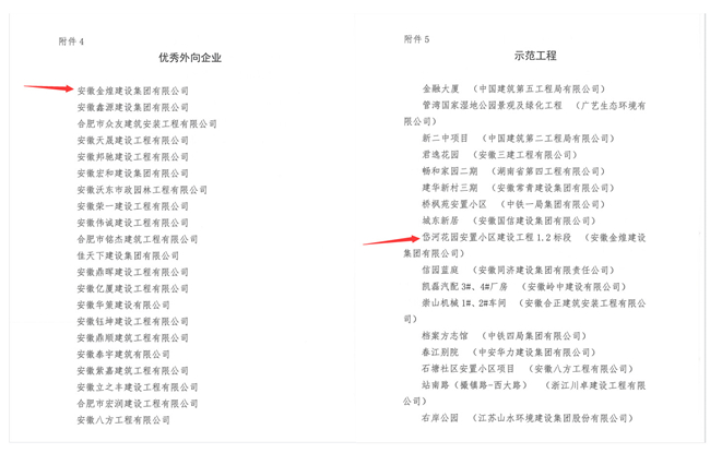 近日,从肥东县住房和城乡建设局获悉,安徽金煌建设集团有限公司荣获2021年度肥东县建筑业龙头企业称号、2021年度肥东县建筑业优秀外向企业称号、所承建的岱河花园安置小区工程荣获肥东县建筑业示范工程称号。