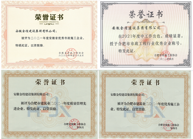 喜获企业荣誉分别是:2021年度安徽省优秀市政施工企业;2021年度合肥市优秀市政施工企业;2021年度合肥市建筑业优秀施工企业;2021年度合肥市建筑业质量管理先进企业称号。
