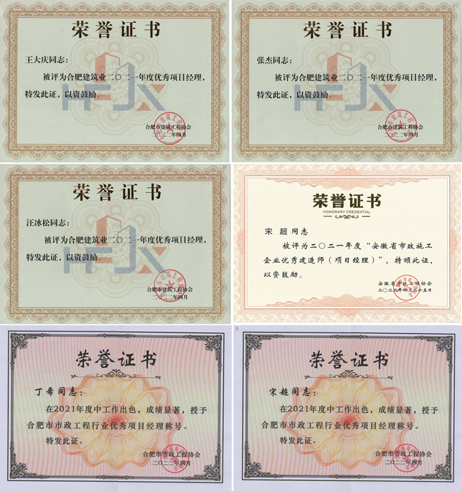 喜获个人荣誉分别是:宋超同志荣获2021年度安徽省市政施工企业优秀项目经理、丁希、宋超两位同志荣获2021年度合肥市市政施工企业优秀项目经理;汪冰松、王大庆、张杰三位同志荣获2021年度合肥市建筑业优秀项目经理称号。