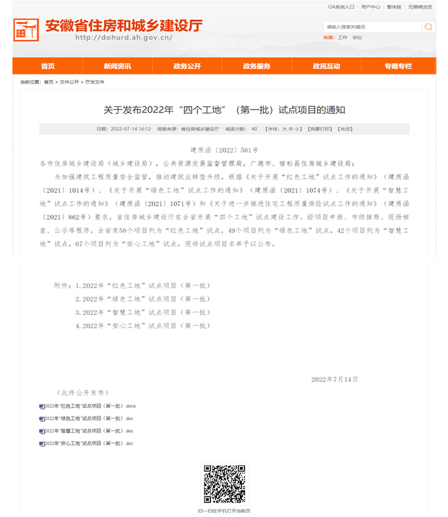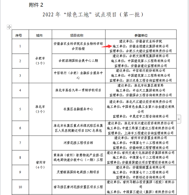 为加强建筑工程质量安全监管,推动建筑业转型升级,安徽省住房和城乡建设厅在全省开展“四个工地”试点建设工作。经项目申报、市级推荐、现场核查、公示等程序,安徽金煌建设集团承建的安徽省农业科学院农业生物科学综合实验楼被安徽省住房和城乡建设厅授予2022年“绿色工地”试点项目。