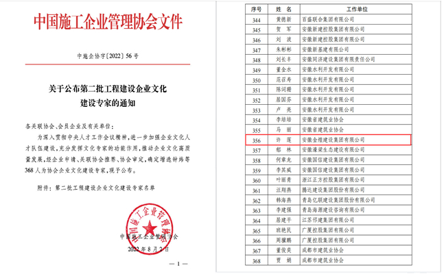 为推进工程建设企业文化建设的高质量发展,促进企业文化人才培养和文化的创作繁荣,在中国施工企业管理协会刚刚公布的中施企协字(2022)56号关于公布2022年工程建设企业文化作品竞赛结果的通知的文中获悉,由安徽金煌建设集团有限公司选送的金煌集团微信公众号脱颖而出,被评为优秀等级。许莲同志被评为中国施工企业协会工程建设企业文化建设专家。这是金煌集团首次参与全国建设领域企业文化建设评选,成绩斐然。