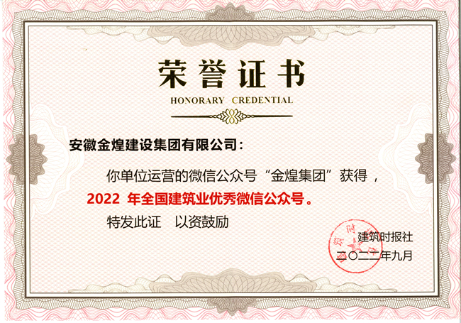 金煌集团微信公众号荣获“全国建筑业优秀微信公众号”称号