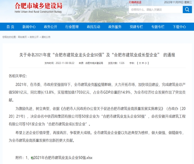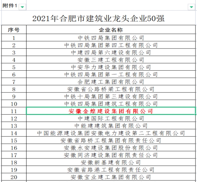 2022年11月8日,从合肥市城乡建设局网站公告关于命名2021年度“合肥市建筑业龙头企业50强”及“合肥市建筑业成长型企业”的通知中获悉,安徽金煌建设集团有限公司再次被合肥市城乡建设局命名为“合肥市建筑业龙头企业50强”称号,排序第11位。