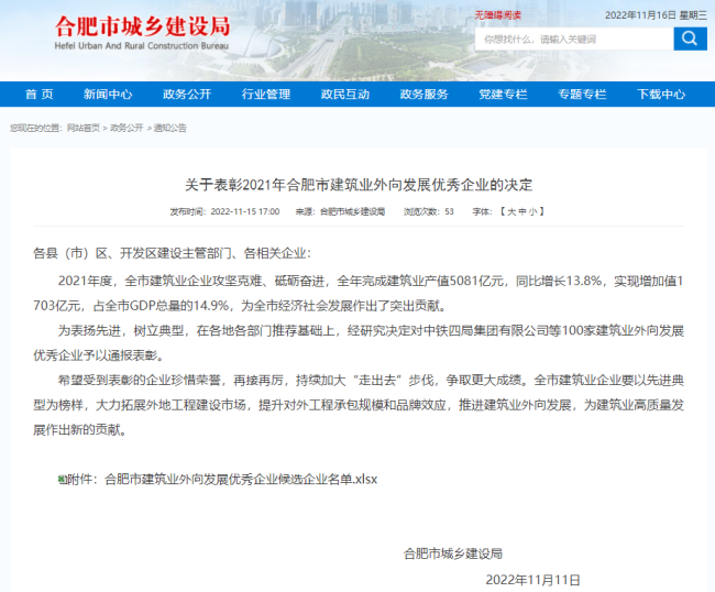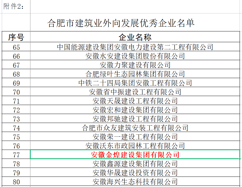 近日从合肥市城乡建设局公布的关于表彰2021年合肥市建筑业外向发展优秀企业的决定中获悉,安徽金煌建设集团有限公司荣获2021年合肥市外向发展优秀企业称号。