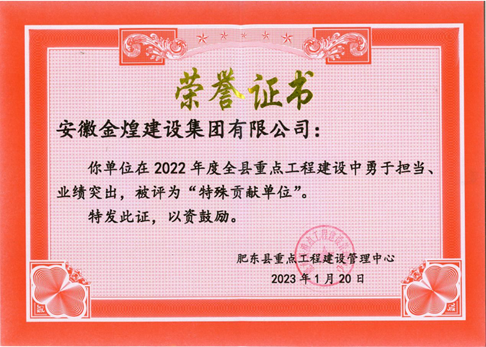 近日从合肥市肥东县重点工程建设管理中心公布的关于表彰2022年度重点工程建设先进单位通知中获悉,金煌集团荣获“特殊贡献单位”荣誉,也是获得该荣誉的唯一的建筑企业。