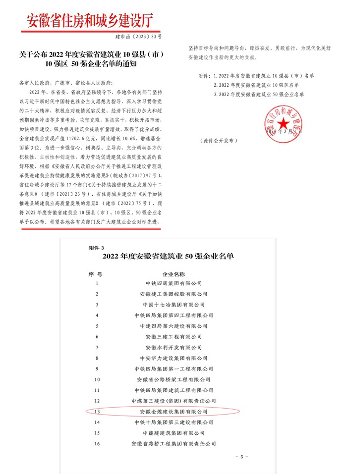 近日,由安徽省住房和城乡建设厅发文“关于公布2022年度安徽省建筑业50强企业名单的通知”中获悉,安徽金煌建设集团再次荣膺安徽省建筑业50强企业荣誉称号,排序第13位,较2021年度递进两位。这是行业主管单位对企业综合实力和持续健康发展的认可和支持。