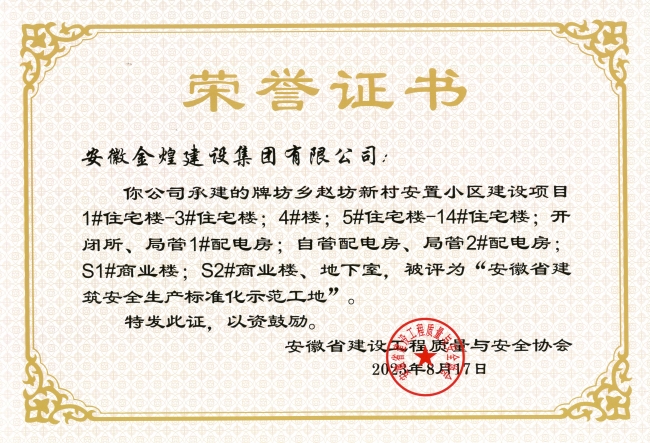近日,从安徽省建设工程质量与安全协会公布2023年度第二批“安徽省建筑安全生产标准化示范工地”名单中获悉,我公司承建的牌坊乡赵坊新村安置小区建设项目获评“安徽省建筑安全生产标准化示范工地”荣誉称号。