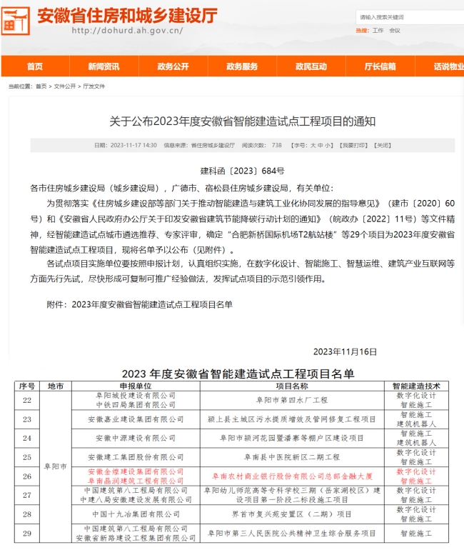 阜南农村商业银行股份有限公司总部金融大厦项目入选2023年度安徽省智能建造试点工程