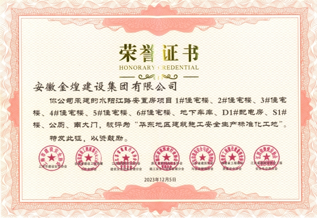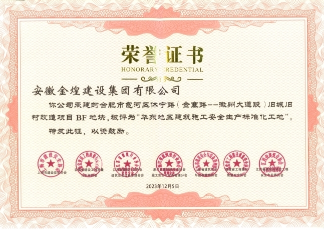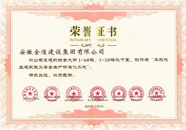 12月20日,从华东地区建筑安全联谊会五届一次会议上传来喜讯,由金煌集团承建的合肥市包河区休宁路BF地块项目、水阳江路安置房项目、硕金大街三个项目荣获2023年度华东地区建筑施工安全生产标准化工地称号。