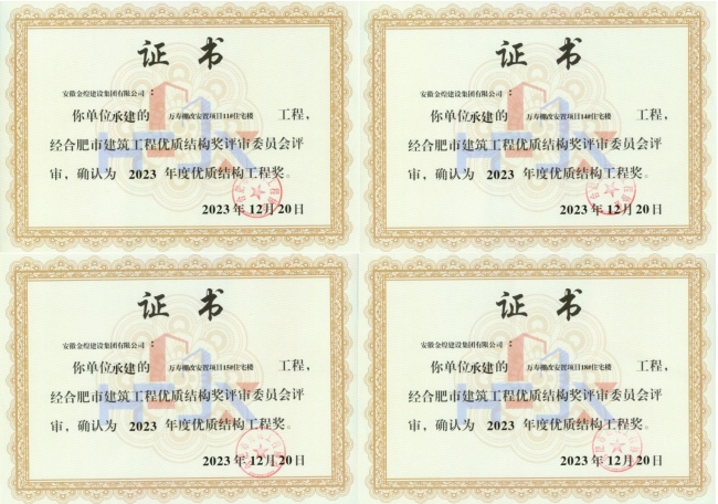 从各行业主管部门公告的工程质量类表彰获悉,金煌集团荣获7项合肥市优质工程“琥珀杯”奖,1项阜阳市优质工程“颍州杯”奖,1项阜阳市建设工程质量标准化创建示范工程,12个单体工程荣获合肥市优质结构奖。