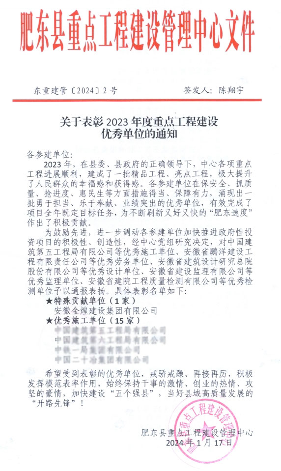 时序至腊,诸事粥全。肥东县重点工程管理中心为鼓励先进,进一步调动各参建单位推进政府投资项目的积极性和创造性,对相关单位进行通报表彰,金煌集团荣获特殊贡献单位奖,也是该奖项的唯一获奖单位。